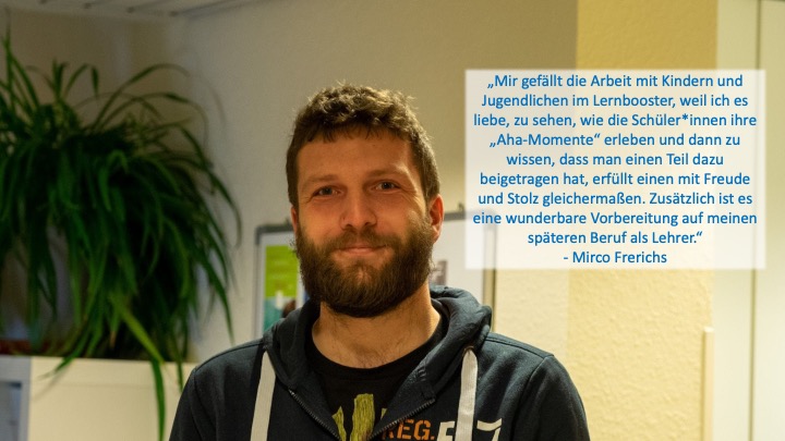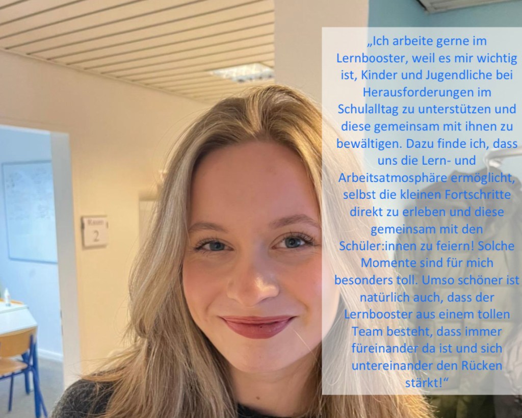 Unser Team setzt sich aus Student:innen, ausgebildeten sowie pensionierten Lehrkräften zusammen. Ganz nach dem Motto von Lehrer:innen mit Schüler:innen lernen ist es als Lernbooster unser Ziel, jung und alt – Ambition und Erfahrung – zusammenzubringen, um einen möglichst großen Wissensaustausch zu generieren.